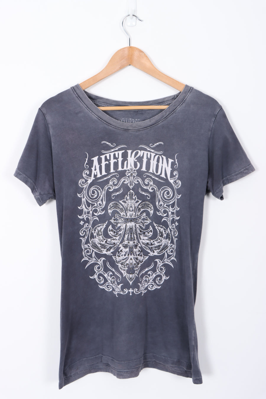 AFFLICTION Rhinestone Graphic Lace Back Detail Tee (L Women's)