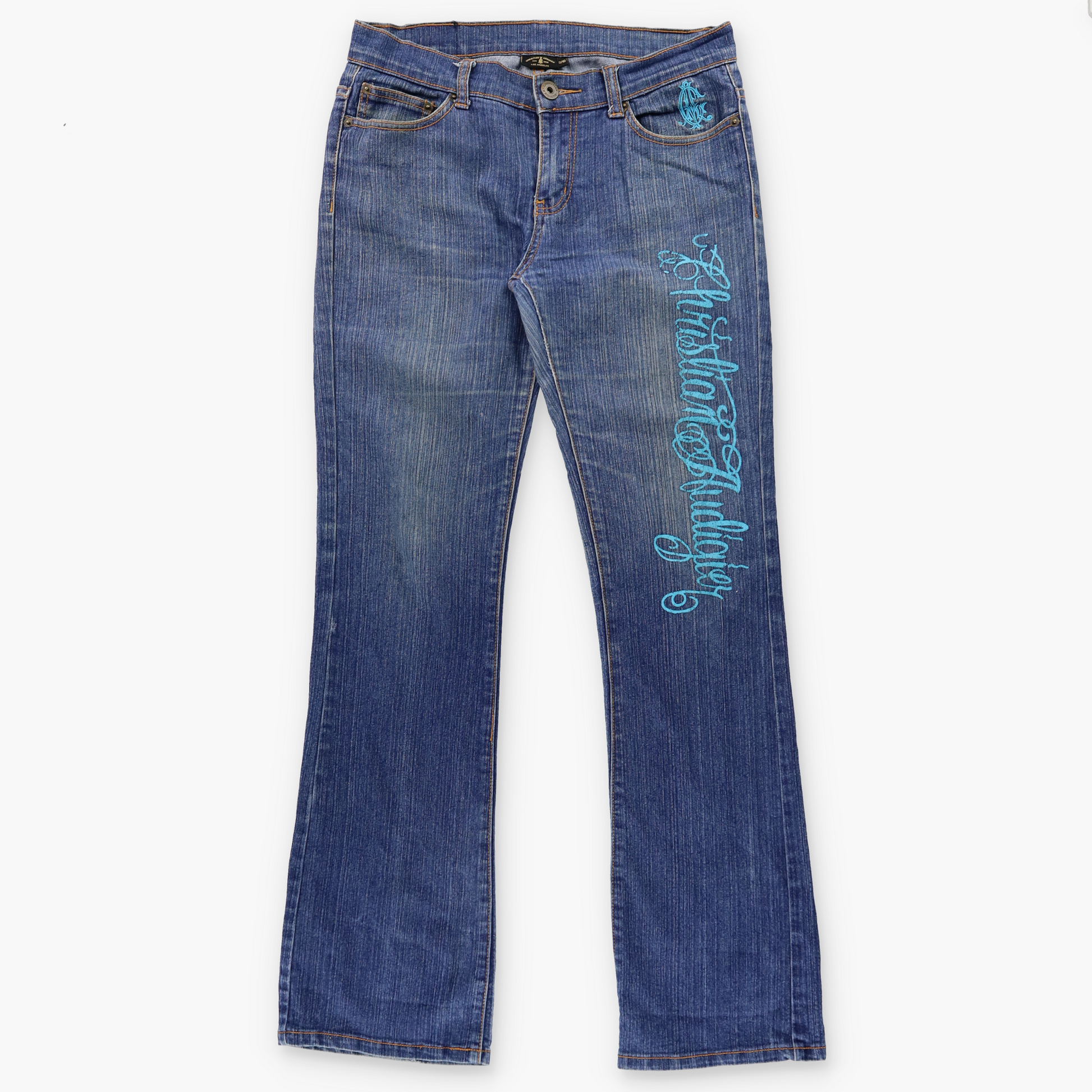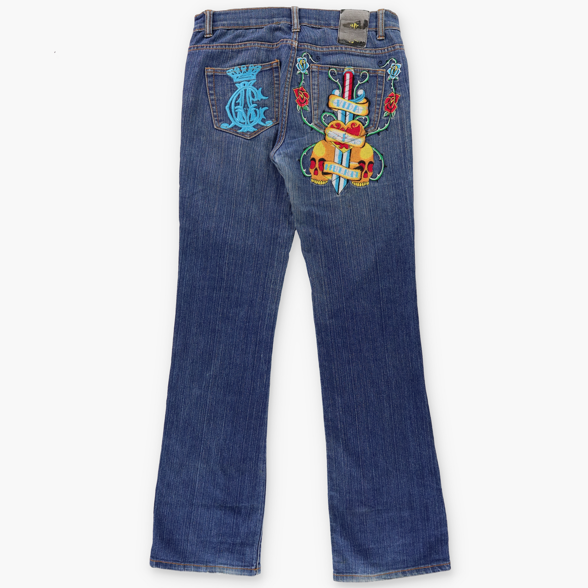 CHRISTIAN AUDIGIER Skull & Dagger "Vida Muerte" Embroidered Pocket Bootcut Jeans (32)