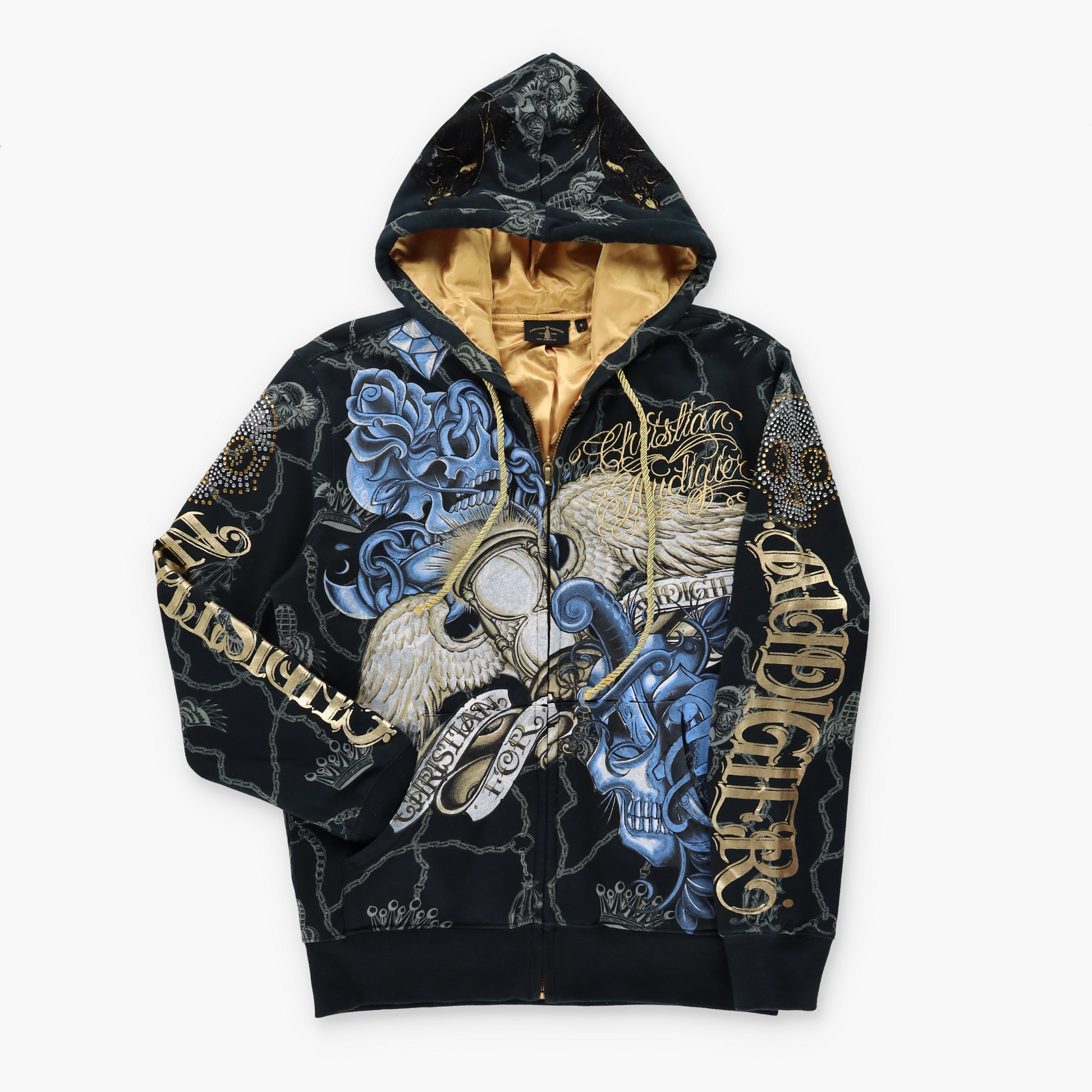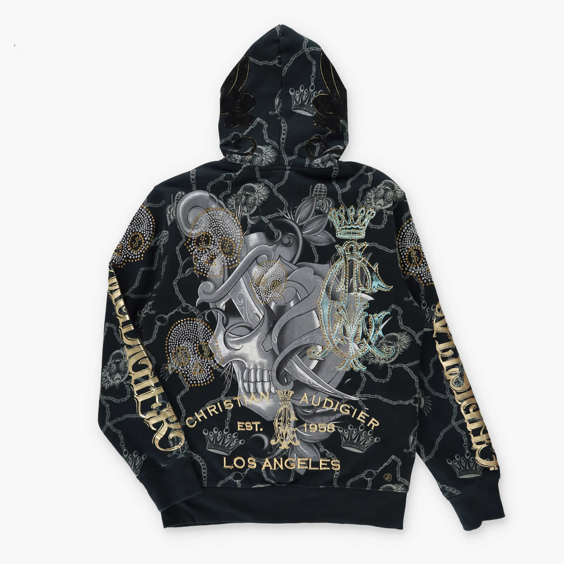 CHRISTIAN AUDIGIER Winged Hourglass & Rhinestone Skulls Gold Embroidered Hoodie Sweatshirt (S-M)