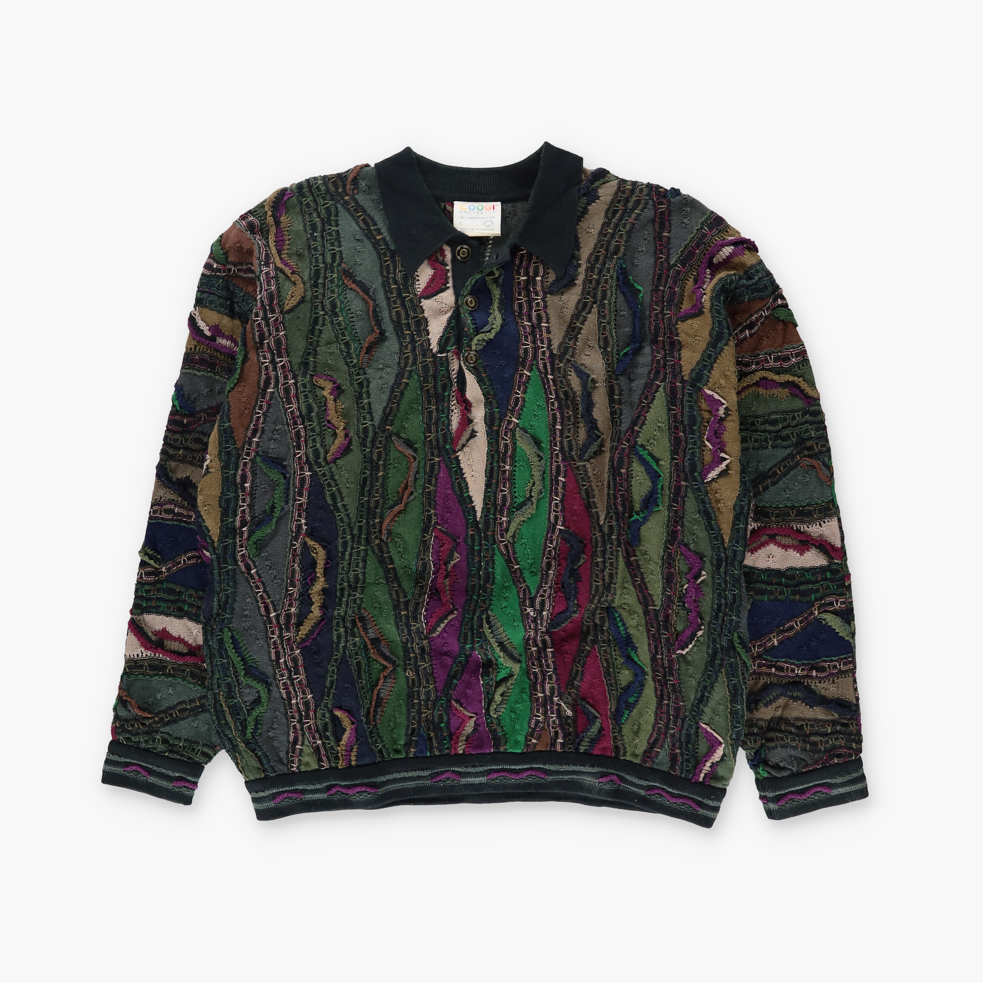 COOGI AUSTRALIA Green Multicoloured 1/4 Button Collared 3D Knit Sweater (L)