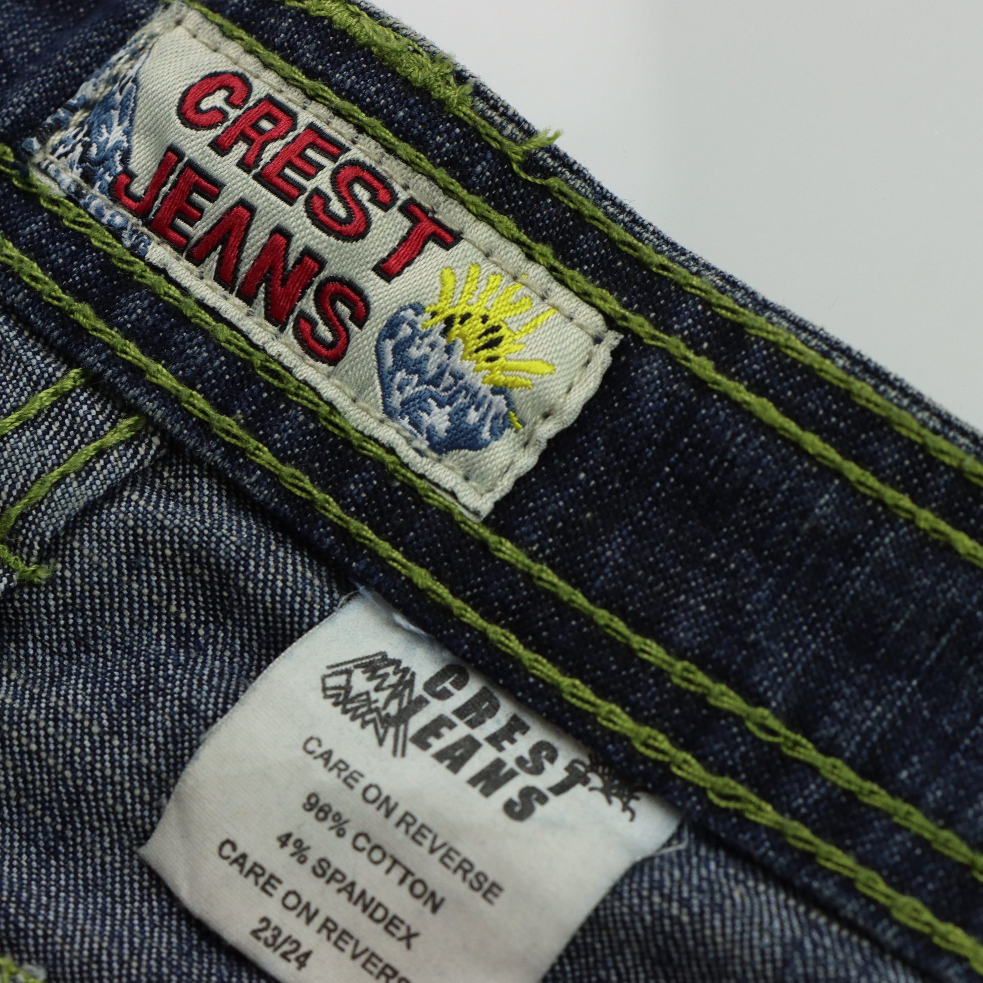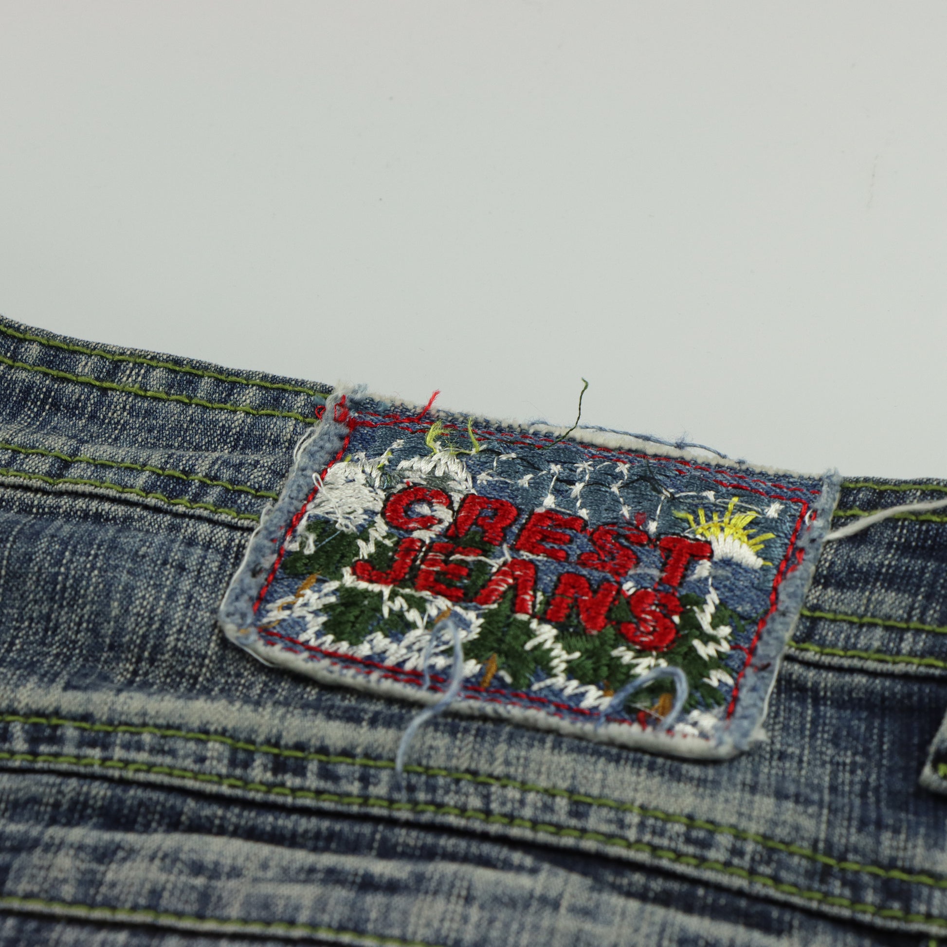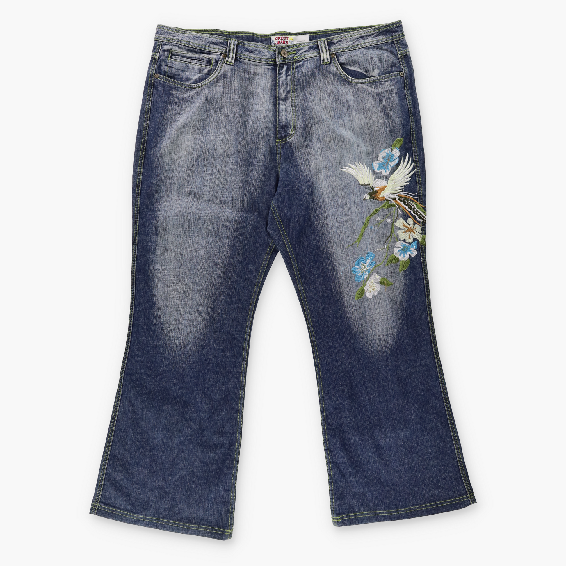 CREST JEANS Embroidered Bird Green Stitch Blue Faded Jeans (Unisex XXXL)