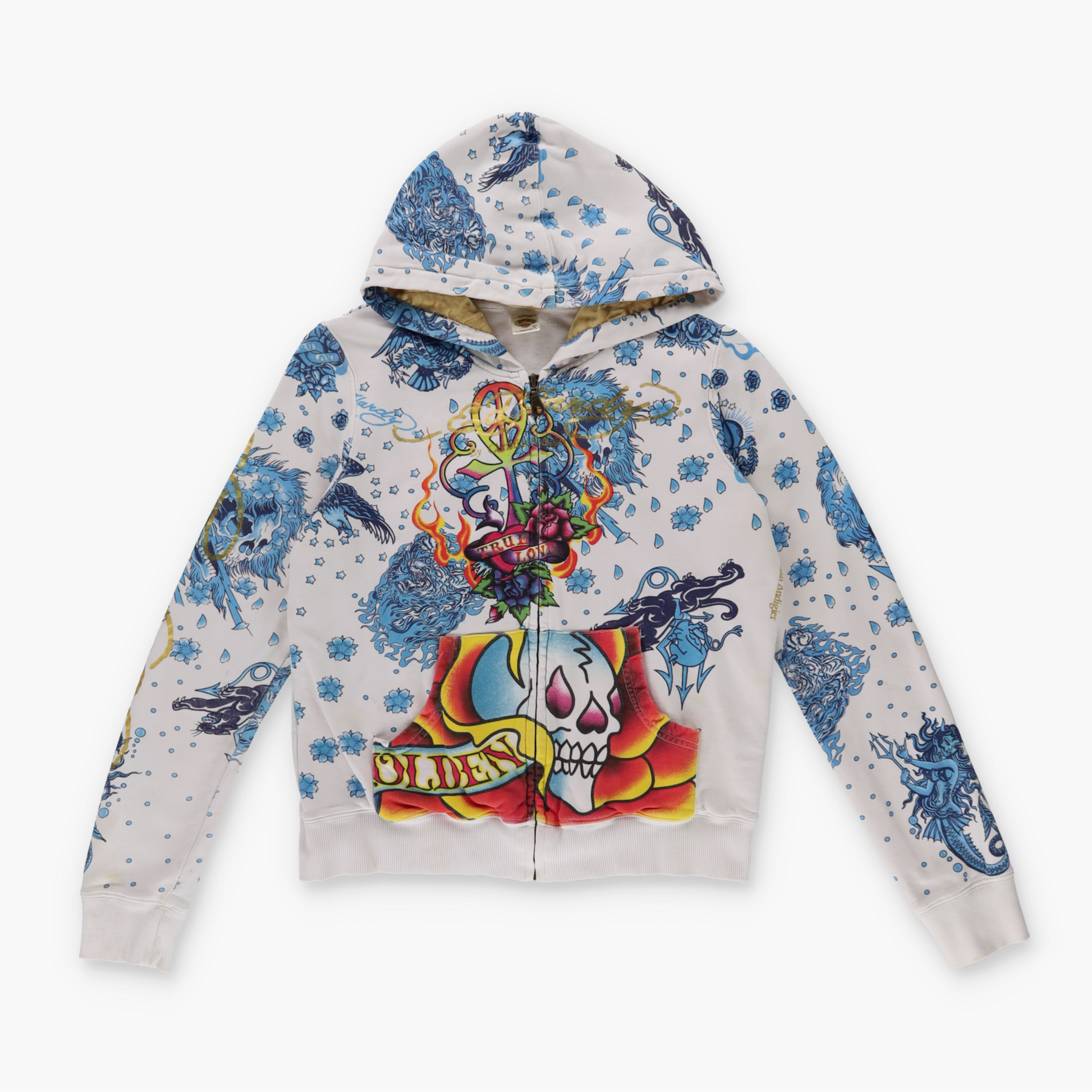 ED HARDY Christian Audigier Y2K Colourful Graphic Zip-Up Hooded Sweatshirt (XS)