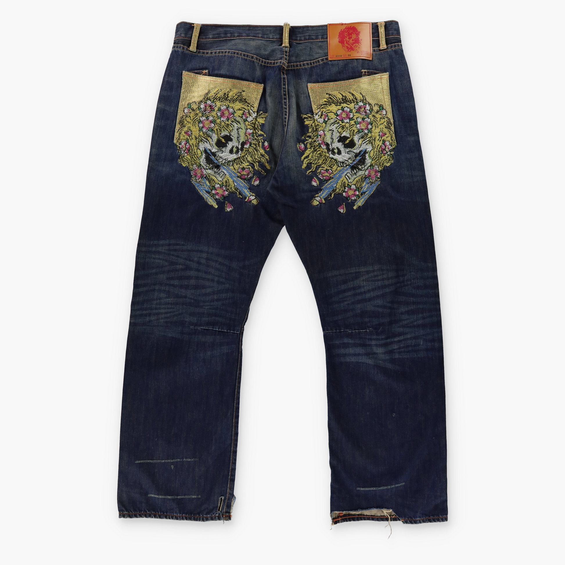 ED HARDY X CHRISTIAN AUDIGIER Embellished Skull Pocket Distressed Jeans (38)