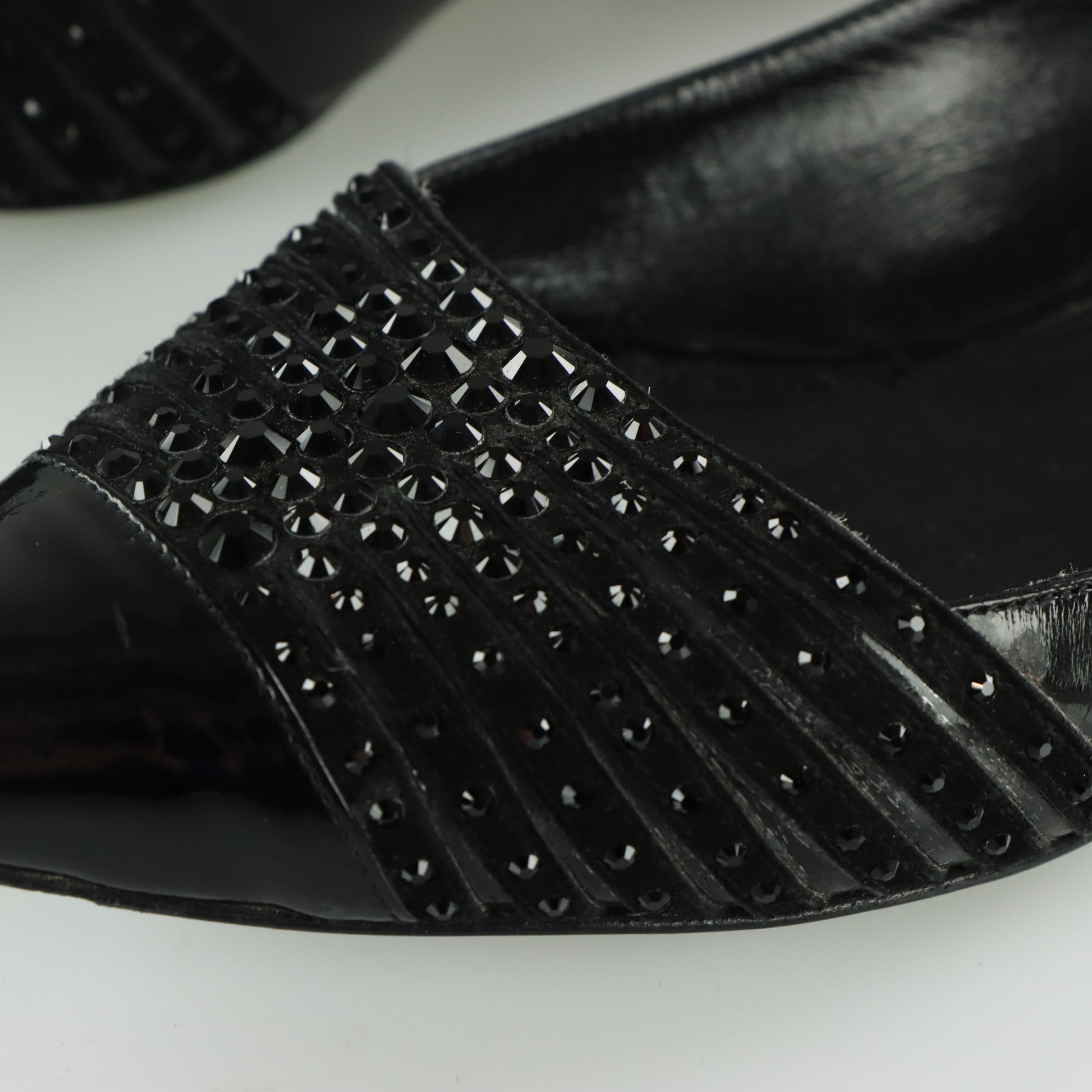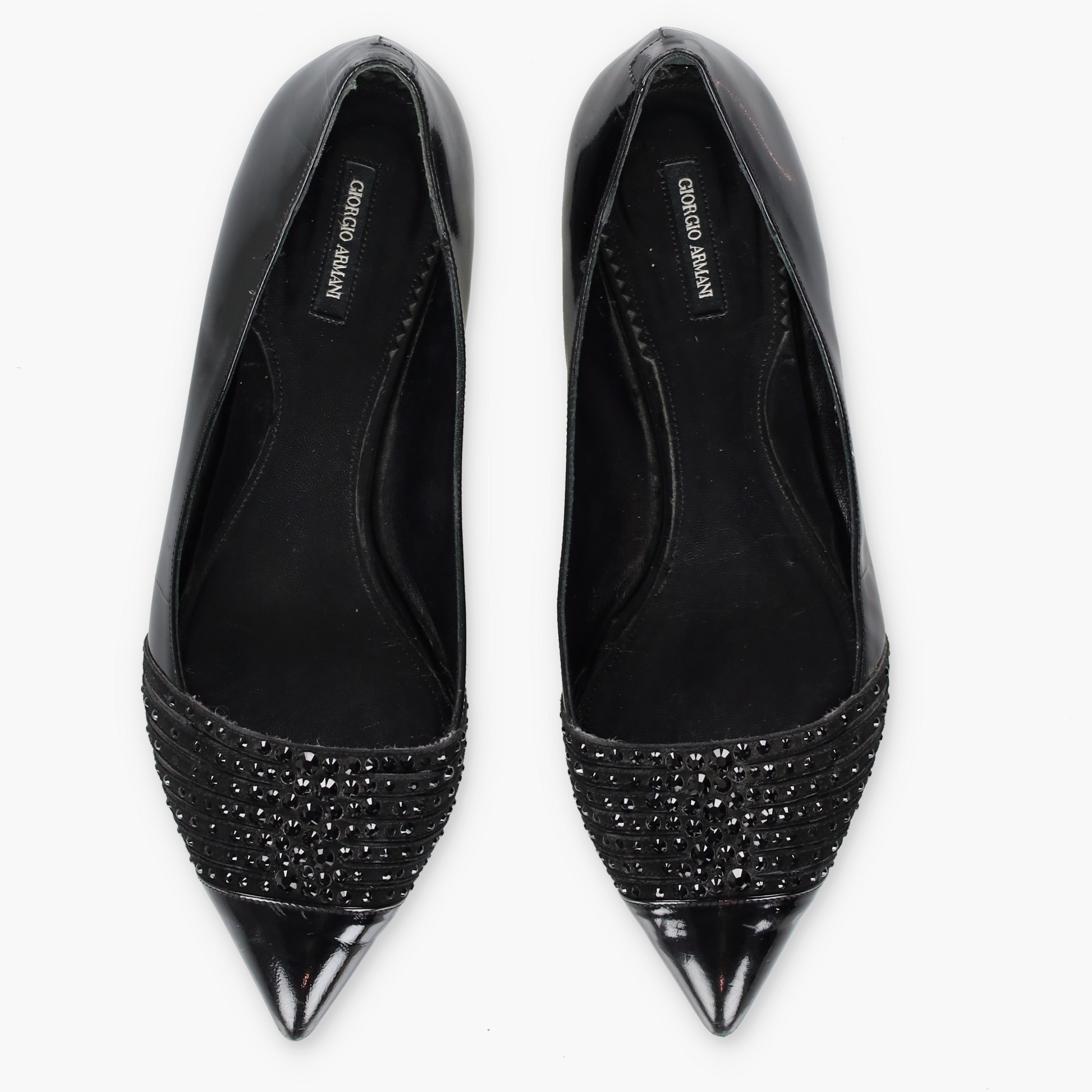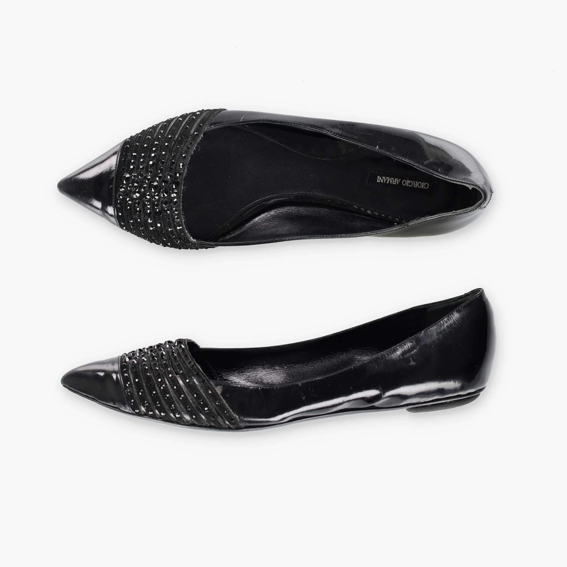 GIORGIO ARMARNI Patent Embellished Italy Made Black Flats (38)