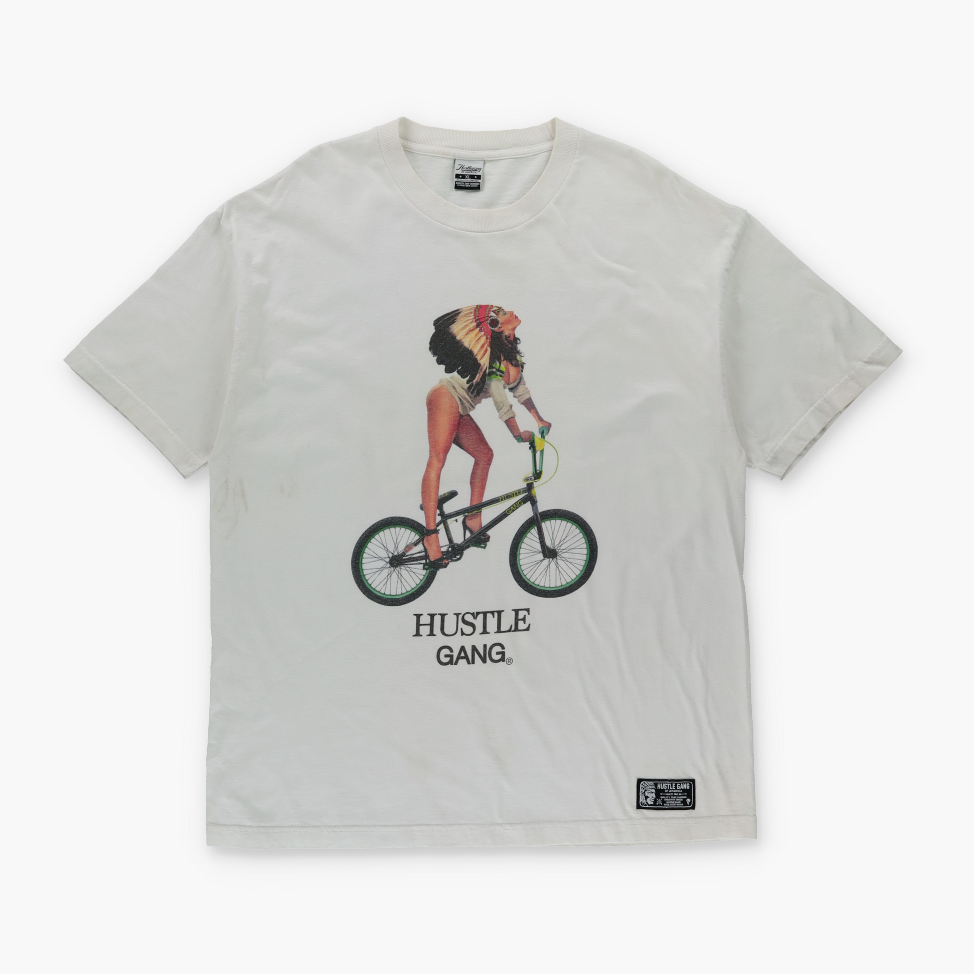 HUSTLE GANG Native American Headdress & Stilettos on Bicycle White T-Shirt (XL)