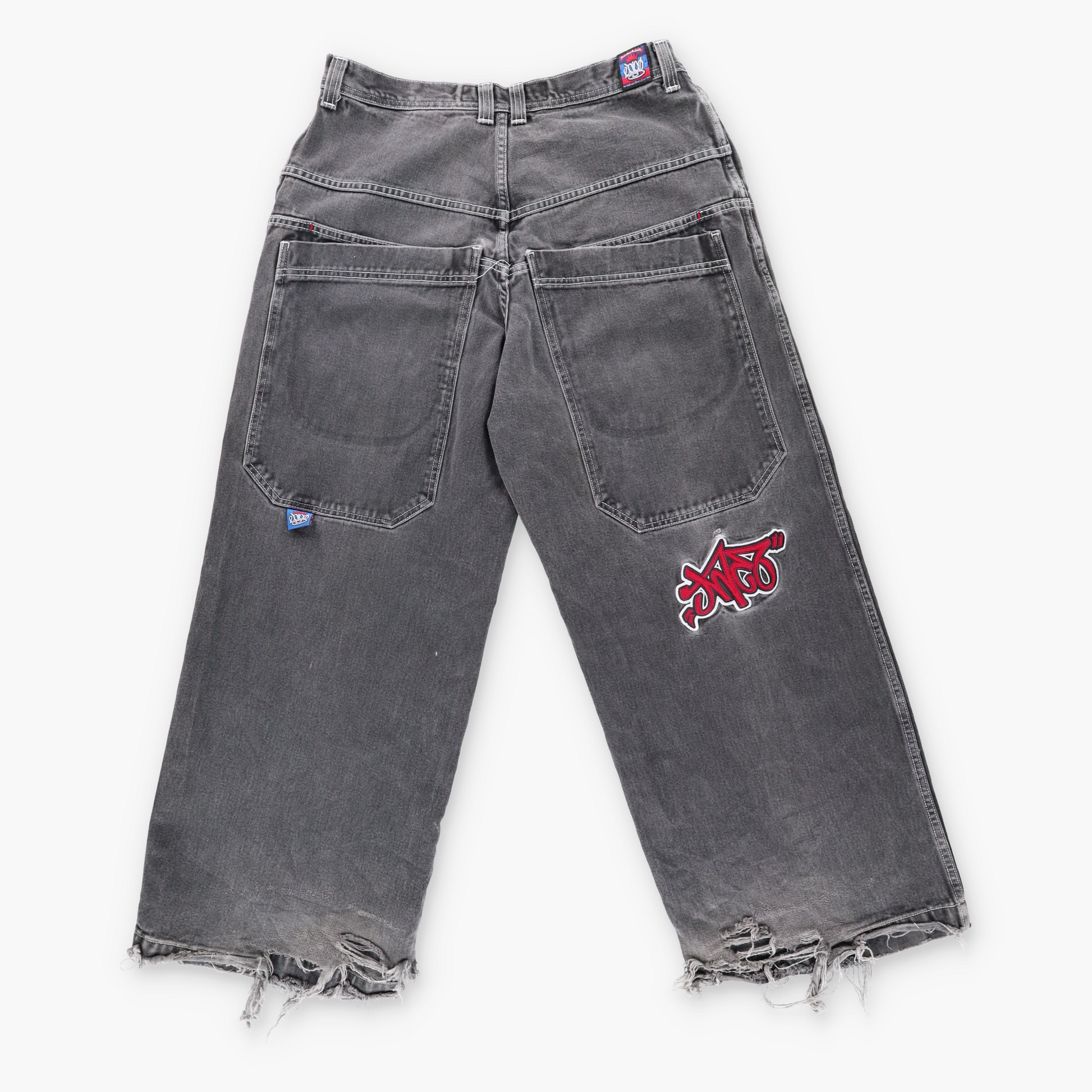 JNCO JEANS Y2K Embroidered Graffiti USA Made Dark Distressed Grey Jeans (36 x 32)