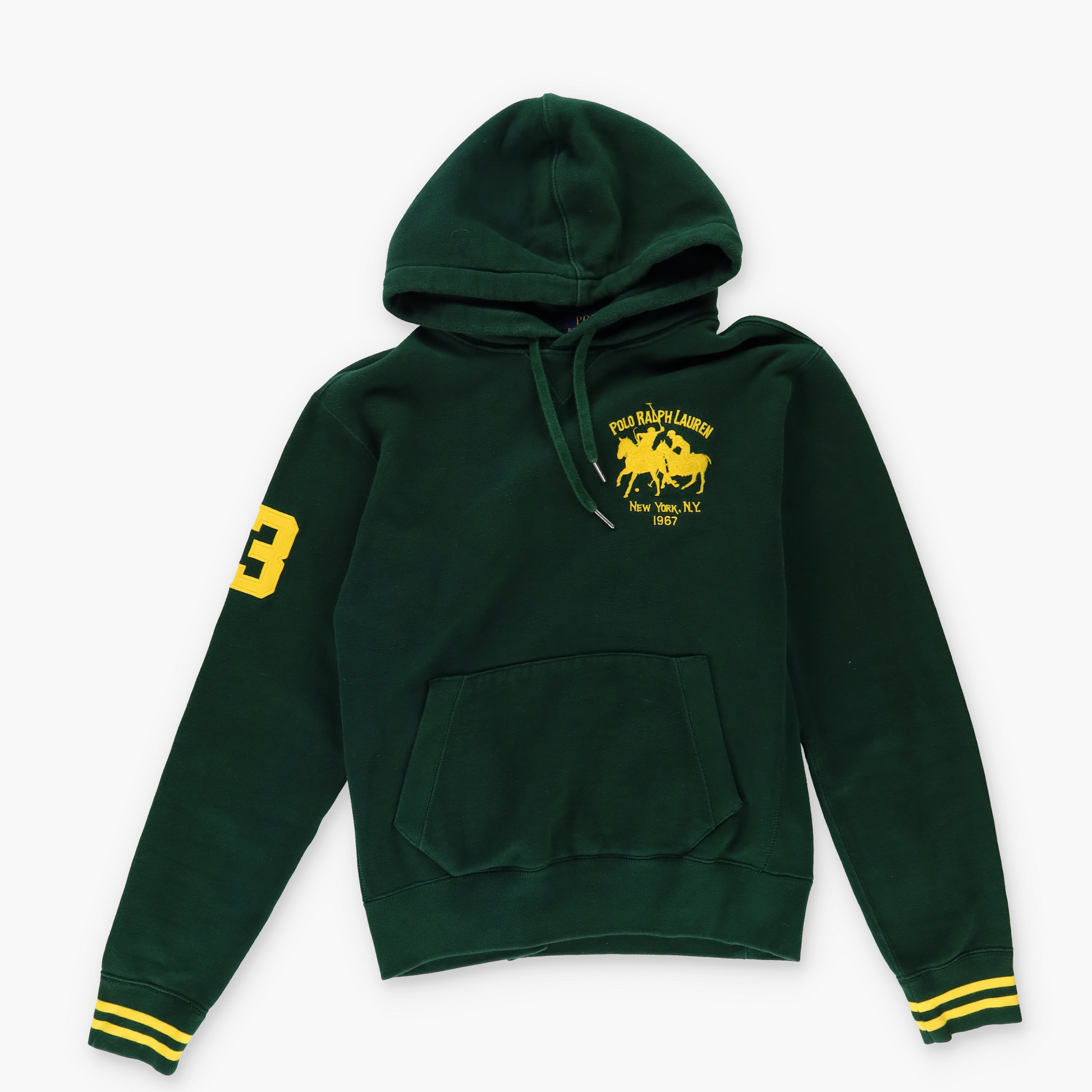 RALPH LAUREN POLO #3 Yellow Embroidered Green Hooded Sweatshirt (M)
