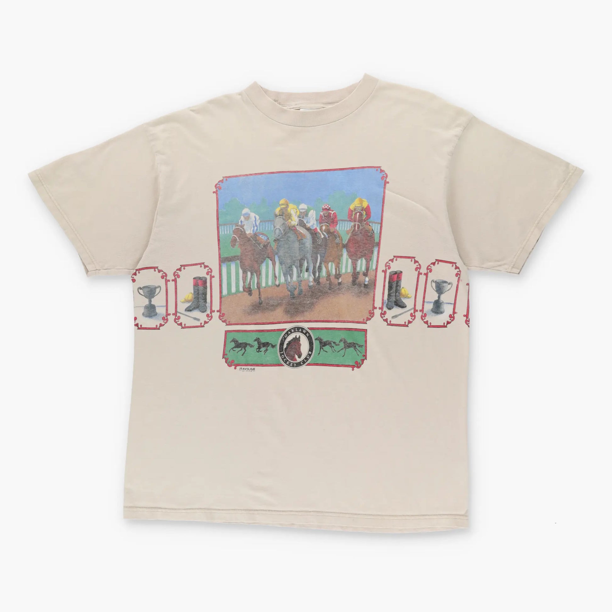 Vintage 1996 Jockey Horse Racing Wrap Around Print Beige T-Shirt (XL)