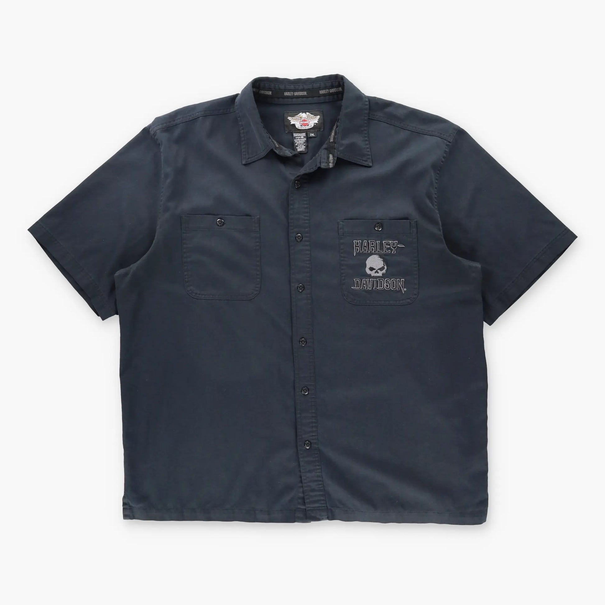 Vintage HARLEY DAVIDSON Embroidered Flaming Skull Short Sleeve Button-Down Biker Shirt (XXL)